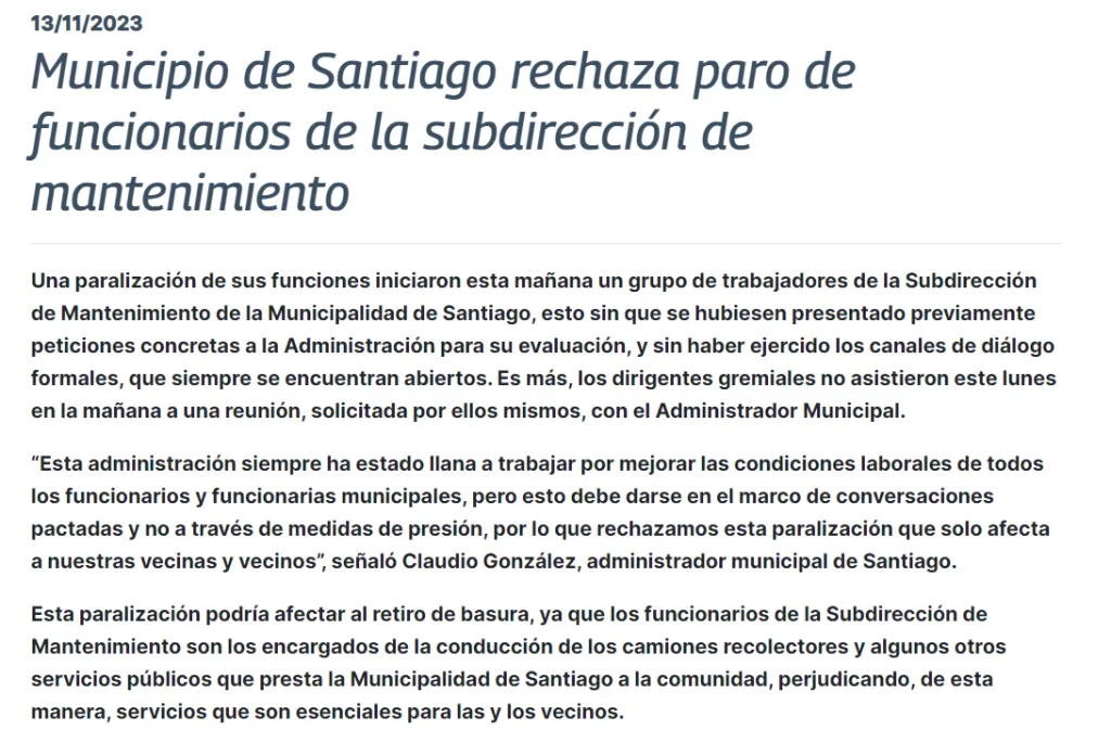 Claudio González, administrador municipal de Santiago, señaló en el comunicado que “Esta administración siempre ha estado llana a trabajar por mejorar las condiciones laborales de todos los funcionarios y funcionarias municipales, pero esto debe darse en el marco de conversaciones pactadas y no a través de medidas de presión”.