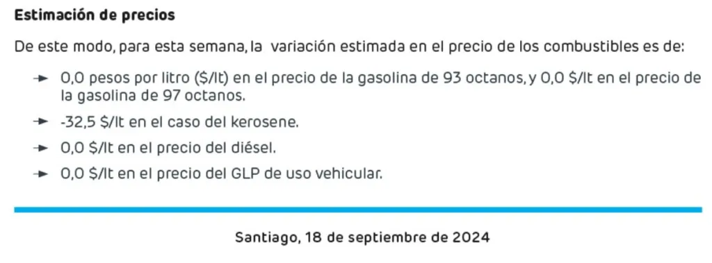 El Informe de Precios de los Combustibles de ENAP con los respectivos cambios (alzas o bajas de precio) serán publicadas el día miércoles anterior, es decir, el 25 de septiembre.