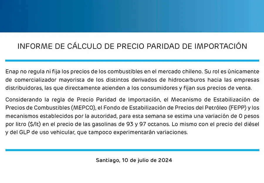 Este miércoles 10 de julio la Empresa Nacional del Petróleo (ENAP) publicó un nuevo informe semanal de precios de los combustibles con todas las novedades para la bencina, diésel y GLP vehicular para esta semana que comienza (jueves 11 de julio al miércoles 17).