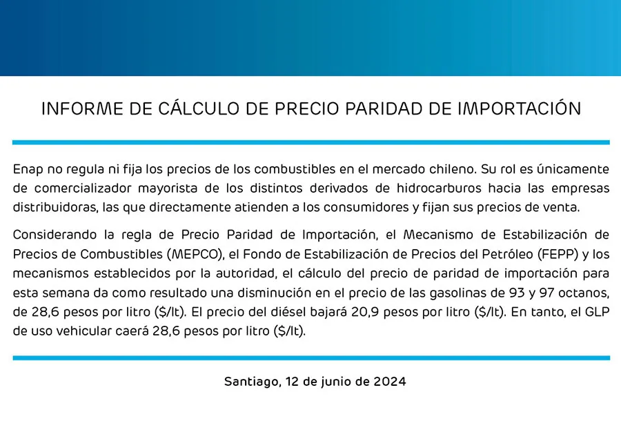 Llegó el día, este miércoles 12 de junio, la Empresa Nacional del Petróleo (ENAP) informó que pasará desde mañana jueves 13 con el precio de la bencina, del diésel-petróleo y del GLP, respectivamente.