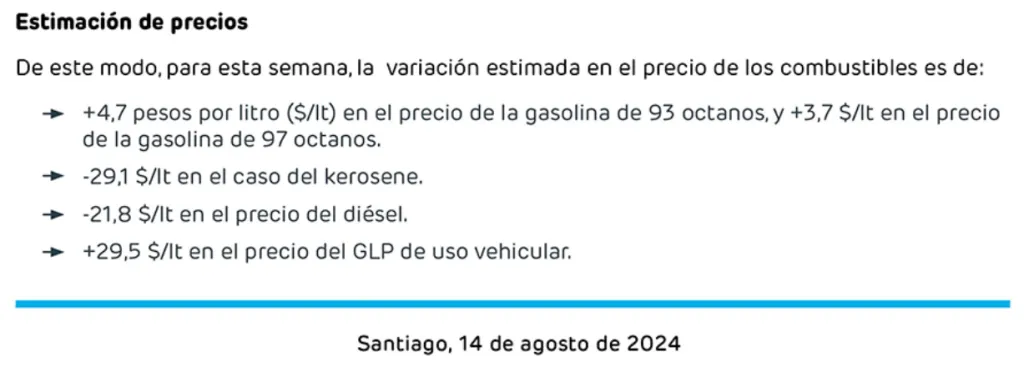 El Informe de Precios de los Combustibles de ENAP con los respectivos cambios (alzas o bajas de precio) serán publicadas el día miércoles anterior, es decir, el 4 de septiembre.