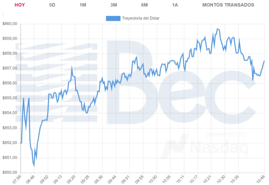 Esta mañana el dólar abrió con $852,00, unos minutos más adelante la divisa llegó a su precio más bajo a las 8:54 horas con $850,51, para luego a las 10:26 repuntar fuertemente y llegar a su peak($859,65).