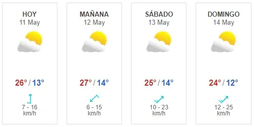 El resto de la semana el clima será similar. El viernes 12 de mayo habrá una máxima de 27°C y una mínima de 13°C; el sábado 13 de mayo una máxima 25°C y una mínima de 14°C; y el domingo 14 de mayo una máxima de 24°C y una mínima de 14°C.