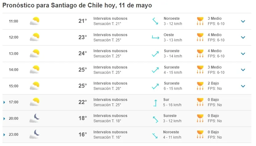 Meteored prevé que las temperaturas aumentarán este jueves 11 de mayo en Santiago. Para la jornada se espera una máxima de 26°C y una mínima 13°C.