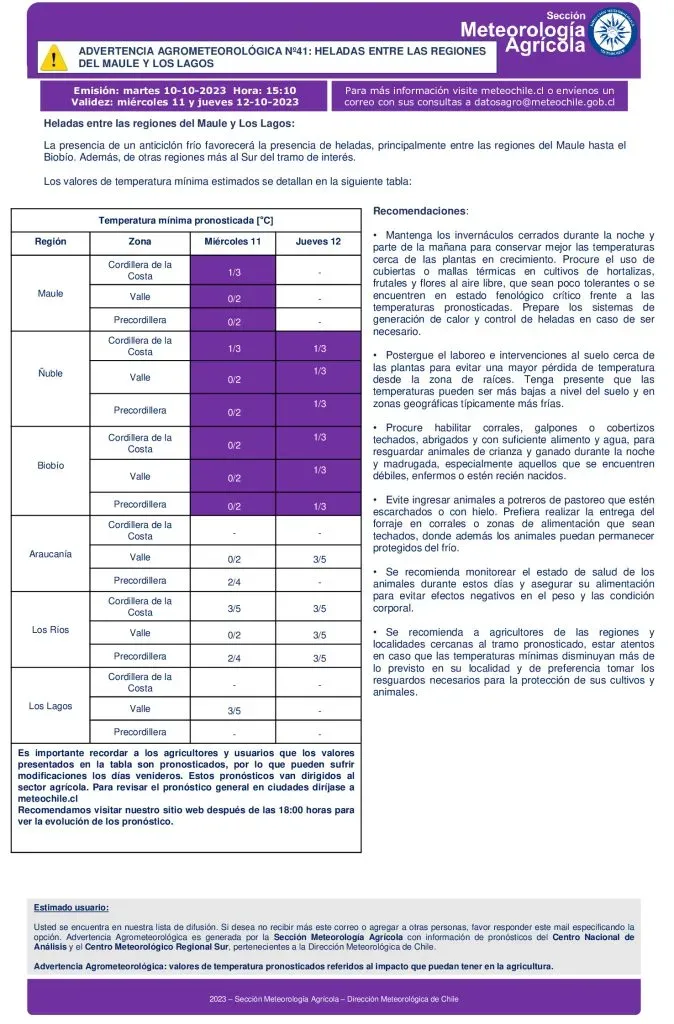 La Dirección Meteorológica de Chile realizó las siguientes recomendaciones ante la Advertencia Agrometeorológica que podría afectar los cultivos de las seis regiones afectadas: