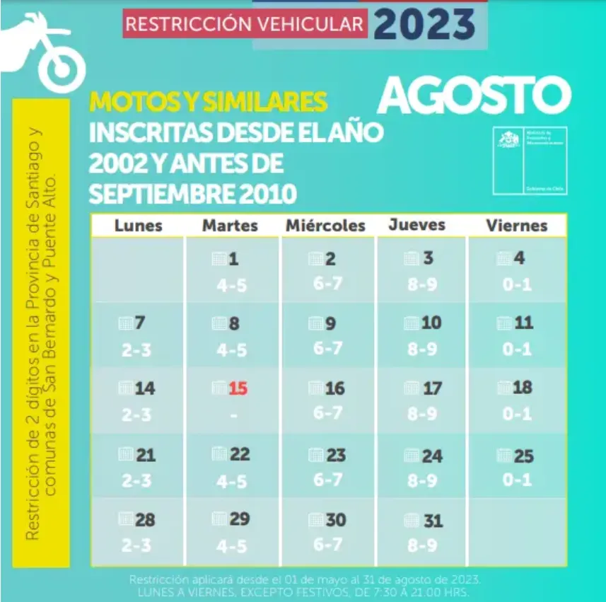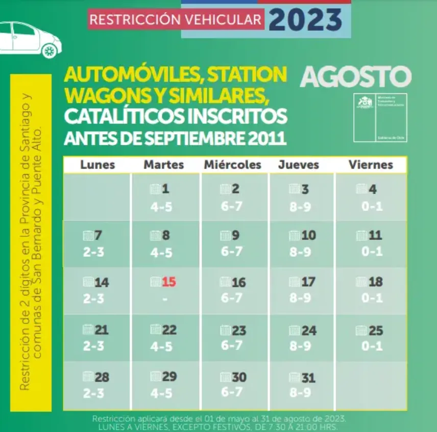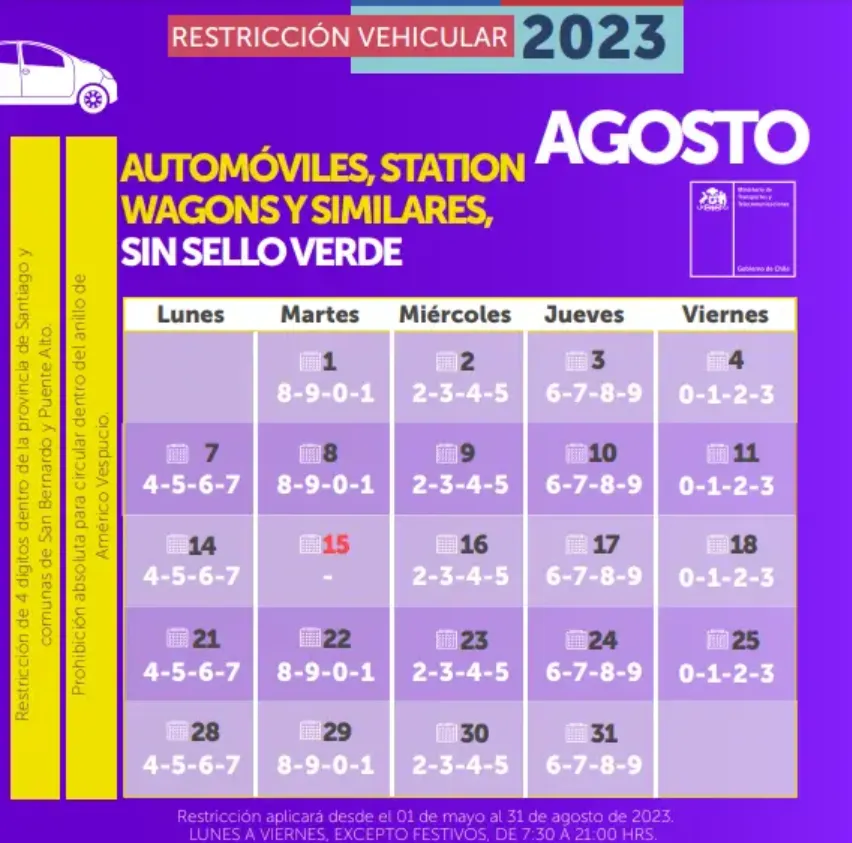 Este miércoles 2 de agosto continúa la restricción vehicular en la Región Metropolitana, medida que finaliza el jueves 31 del mismo mes.