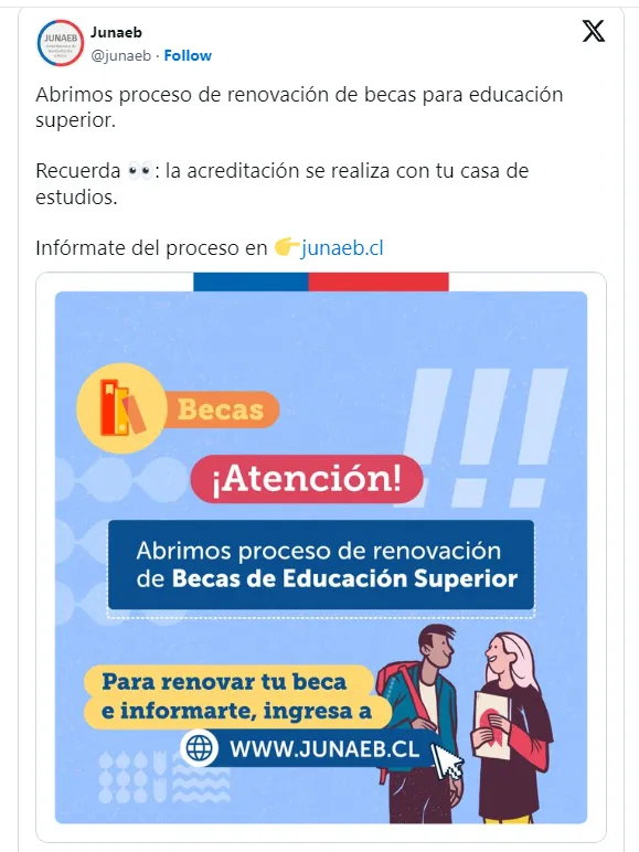 Asimismo, Junaeb hizo un llamado a los estudiantes a matricularse dentro del tiempo establecido y a revisar los requisitos de renovación de cada beca, ya que pueden variar de acuerdo al tipo de beneficio.