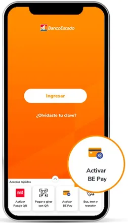 BE Pay es un servicio de la App BancoEstado que te permite pagar en los comercios presenciales, acercando tu teléfono al lector de tarjetas. Solo debes abrir la app y seleccionar la opción “Activar BE Pay” como se ve en la siguiente imagen: