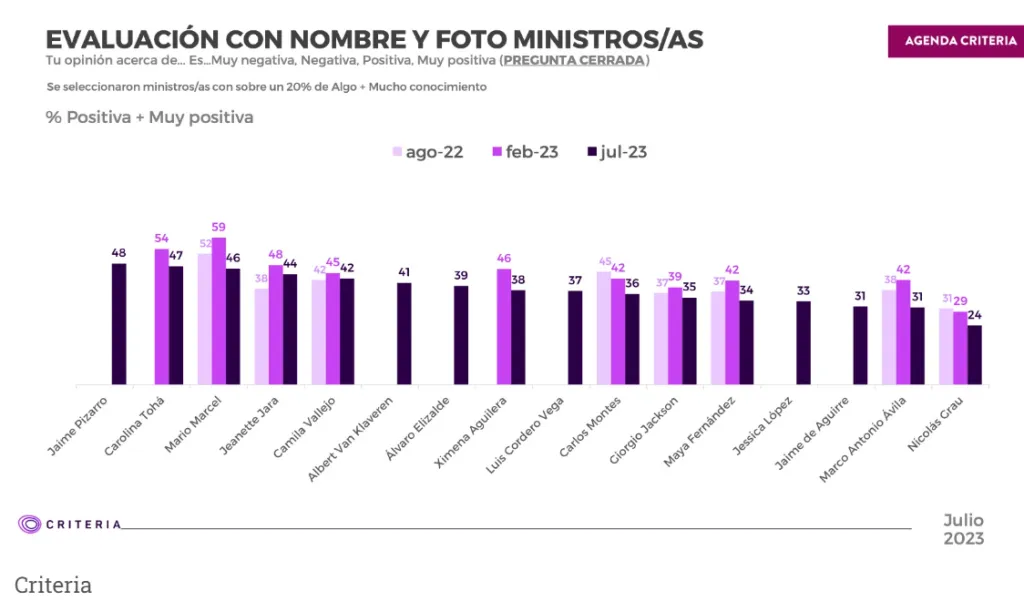 Criteria destacó el alza en conocimiento de la ministra Jeannette Jara, quien subió 9 puntos para ubicarse en un 43% de conocimiento. Aumentaron también Marco Antonio Ávila, quien se ubica en un 37% (+9), Ximena Aguilera con 31% (+7) y Luis Cordero con 26% (+7).