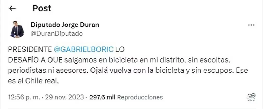 Quien fue más allá con las críticas al presidente Gabriel Boric, fue el diputado Jorge Durán (RN), que en su cuenta de Twitter escribió: “Presidente Gabriel Boric lo desafío a que salgamos en bicicleta en mi distrito, sin escoltas, periodistas ni asesores. Ojalá vuelva con la bicicleta y sin escupos. Ese es el Chile real”.