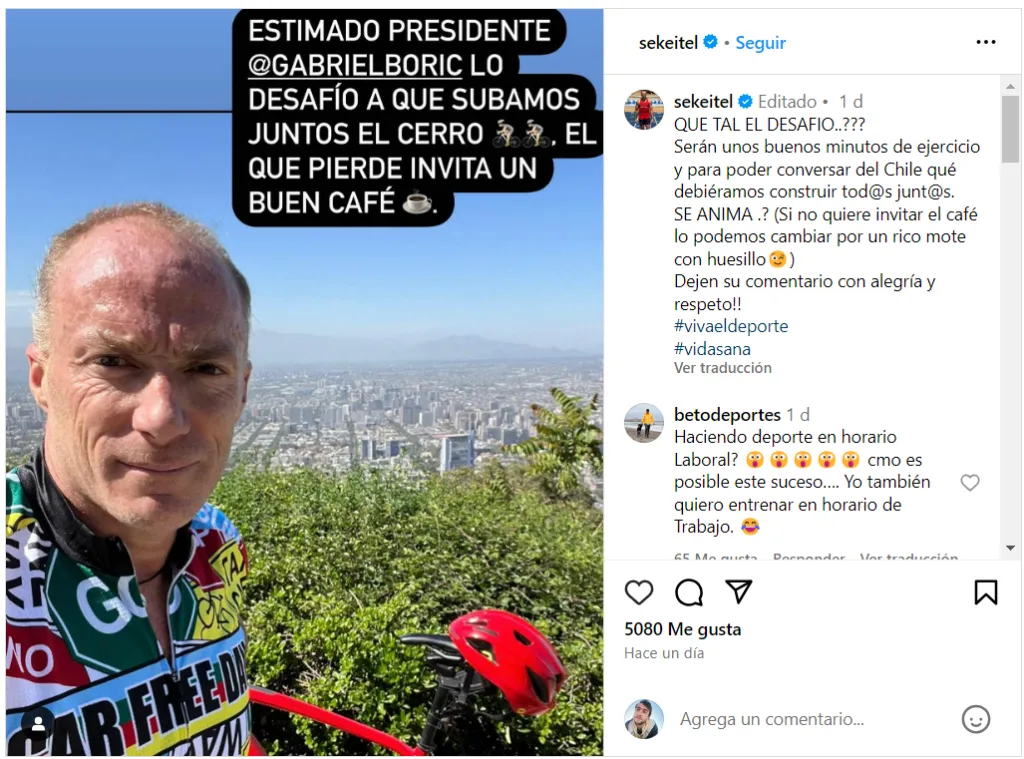 Quien se tomó con mucho más relajo los paseos del presidente Gabriel Boric fue el senador de Evópoli, Sebastián Keitel. El histórico atleta chileno subió una publicación a su cuenta de Instagram en la que desafía al mandatario a una carrera en bicicleta.