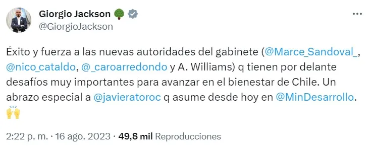 “Éxito y fuerza a las nuevas autoridades del gabinete (Marcela Sandoval, Nicolás Cataldo, Carolina Arredondo y Aurora Williams), q tienen por delante desafíos muy importantes para avanzar en el bienestar de Chile. Un abrazo especial a Javiera Toro, q asume desde hoy en Ministerio de Desarrollo Social“, fue el mensaje que entregó Jackson en sus redes sociales.
