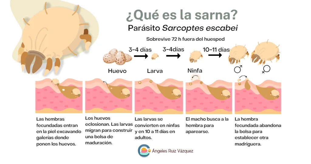 Este ácaro entra en la piel de la persona y pone sus huevos, lo que posteriormente genera una respuesta inmunitaria que causa una fuerte picazón y lesiones a la piel, las que se ubican en general en zonas interdigitales (entre los dedos) o pliegues.