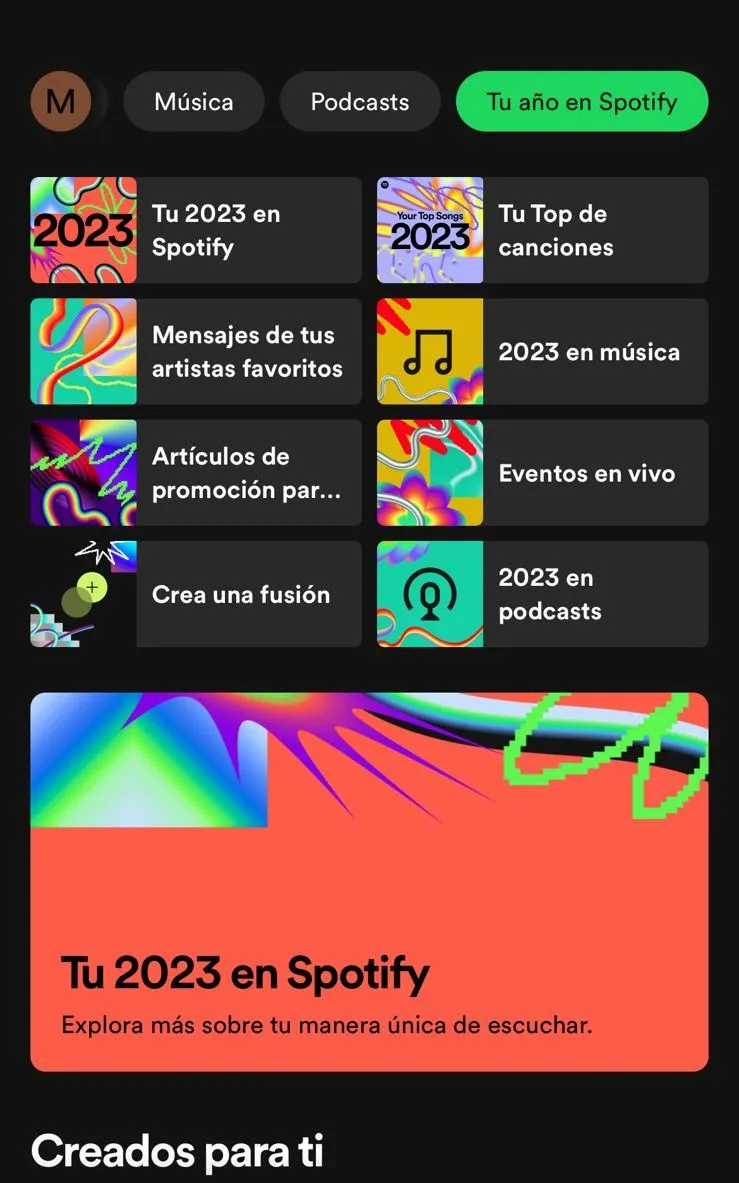 Mientras que desde tu aplicación de celular debes buscar en tu inicio y dar clic en “Tu año en Spotify”, como en la siguiente imagen: