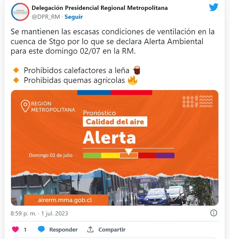 Por cuarto día consecutivo, la Delegación Presidencial de la Región Metropolitana decretó Alerta Ambiental para este domingo 2 de julio en Santiago debido a las malas condiciones del aire.