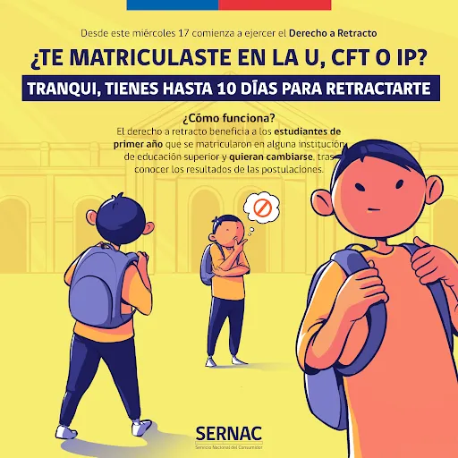 Si eres estudiante de primer año y te matriculaste en alguna institución universitaria, Centro de Formación Técnica o Instituto Profesional, pero te arrepentiste y quieres matricularte en otra, puedes hacerlo gracias al derecho a retracto.