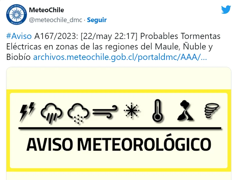El lunes 22 de mayo la Dirección Meteorológica de Chile emitió un aviso por probables tormentas eléctricas que afectarán a tres regiones hasta este martes.