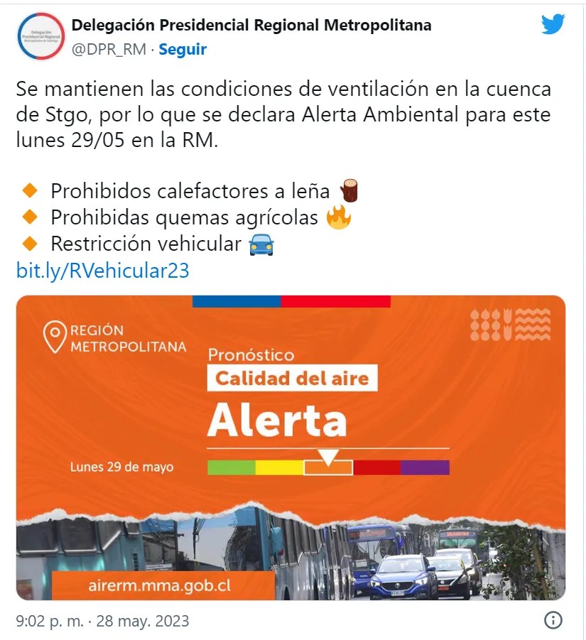 La Delegación Presidencial de la Región Metropolitana decidió declarar Alerta Ambiental para este lunes 29 de mayo, debido a las malas condiciones de ventilación.