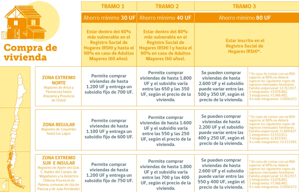 - Tramo 2: Viviendas de hasta 1.600 UF (1.700 UF en algunas regiones).