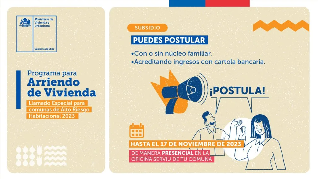 El martes 7 de noviembre comenzó el plazo para postular al “Llamado Especial para comunas de Alto Riesgo Habitacional” del Subsidio de Arriendo del Ministerio de Vivienda y Urbanismo (Minvu). Este beneficio entrega un aporte temporal a la renta mensual que pagan las familias por residir en una vivienda.