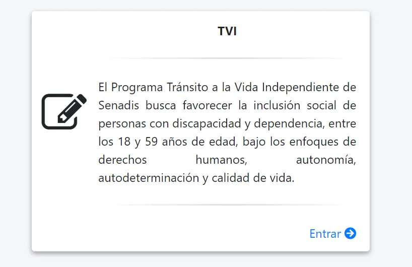 Para postular al Programa Tránsito a la Vida Independiente debes revisar las bases de la postulación. Luego tienes que ingresar al portal del Senadis con tu Clave Única, y hacer clic en “Entrar” en donde dice TVI.