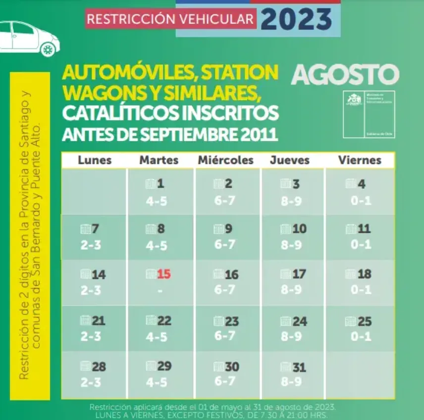 De acuerdo al calendario del la restricción vehicular del Ministerio de Transportes y Telecomunicaciones, está contemplado que finalice el 31 de agosto de 2023.