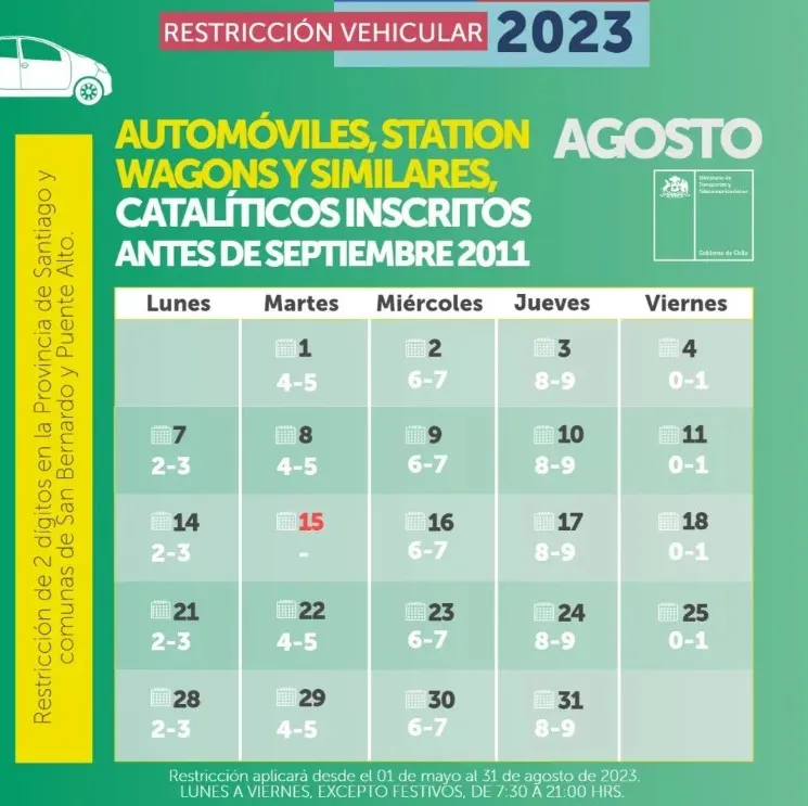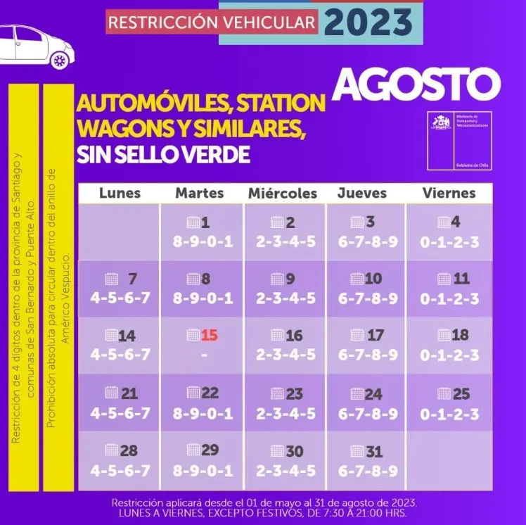 Calendario restricción vehicular mes de agosto: