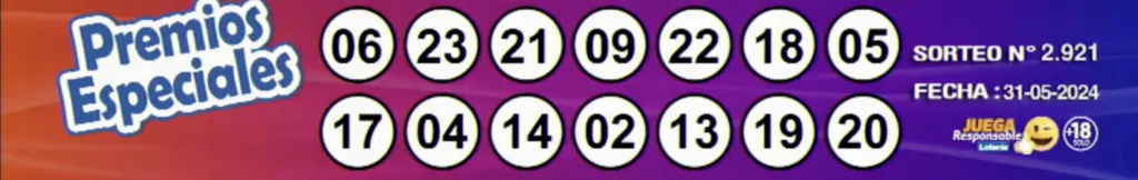 Premios especiales: 06-23-21-09-22-18-05-17-04-14-02-13-19-20