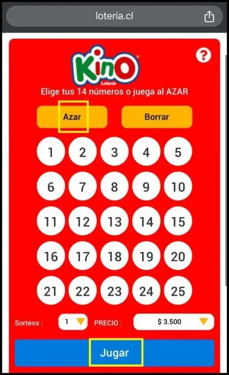 Para jugar al Kino, haz clic en el banner de Kino. Después, elige 14 números entre el 1 y el 25. Si no sabes cuáles elegir, haz clic en “Azar” y el sistema elegirá por ti.