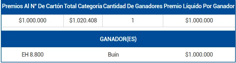 - Premios al N.º de cartón – 1 bono de $1.000.000.