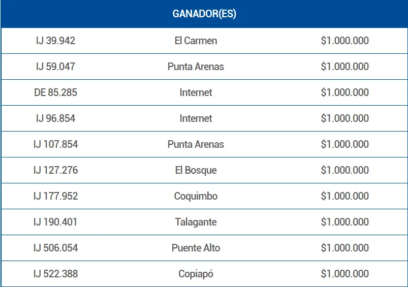 - Premios al N° de cartón: 10 bonos de $1.000.000.