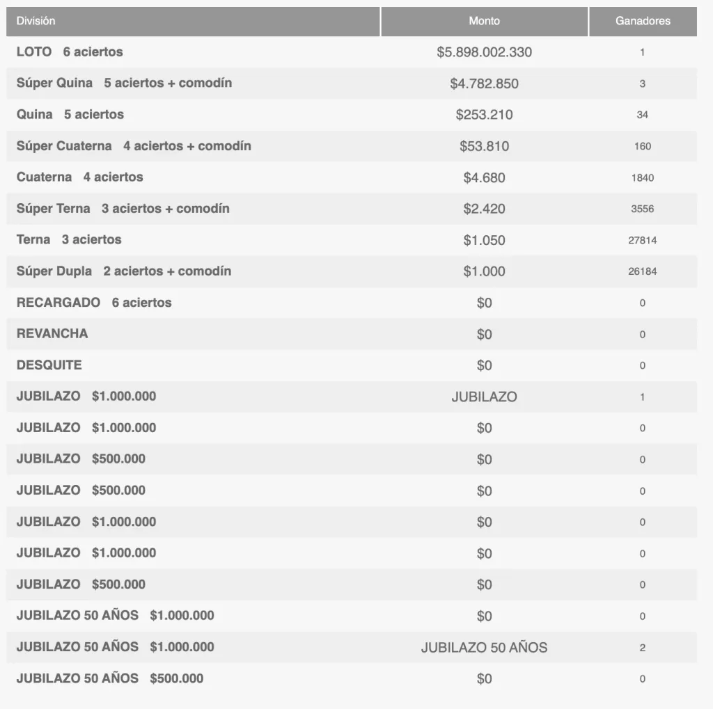 - Loto + Recargado + Revancha + Desquite + Jubilazo: $2.500
