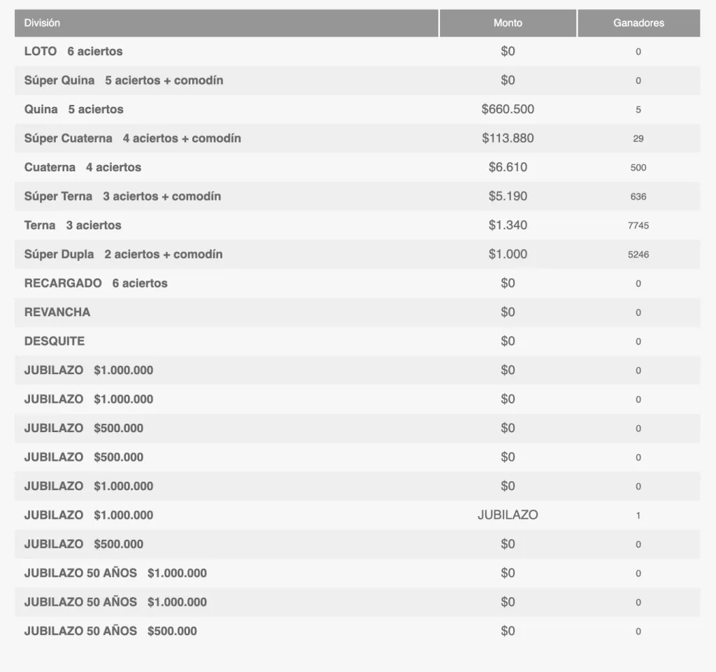 Los números elegidos fueron 9, 12, 13, 29, 31, 32 y comodín 24. Si bien no se informó de un afortunado en la categoría principal, sí se entregó al ganador de la categoría Recargado, que se llevó $1.730.819.250.