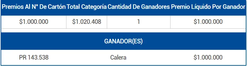 - Premios al N.º de cartón: 1 bono de $1.000.000.