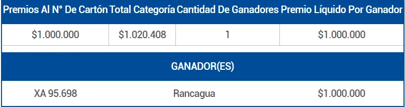 - Premios al N.º de cartón – 1 bono de $1.000.000.