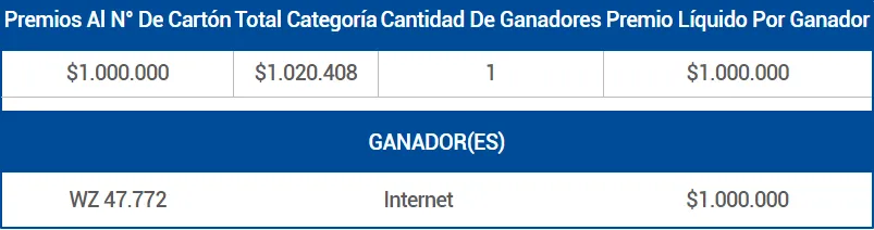 - Premios al N.º de cartón – 1 bono de $1.000.000.