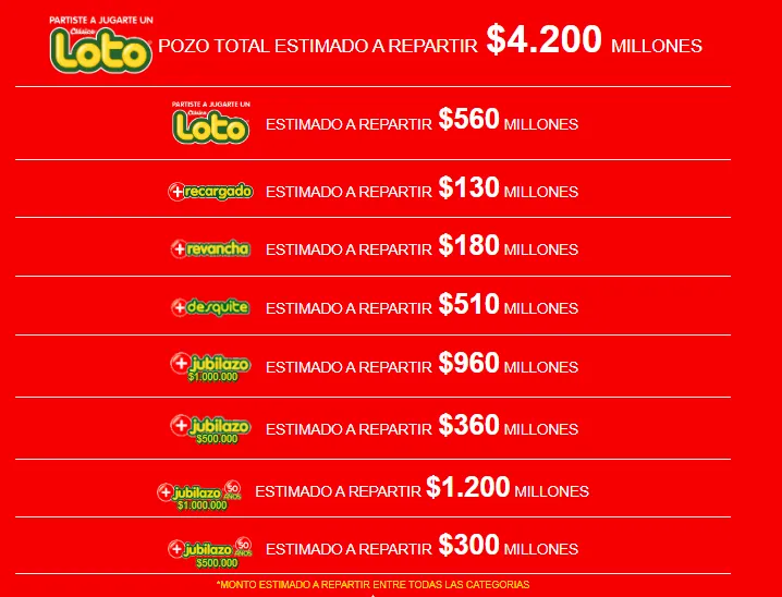 El pozo acumulado para el sorteo de esta noche, será de $4.200 millones de pesos, repartidos de la siguiente manera: