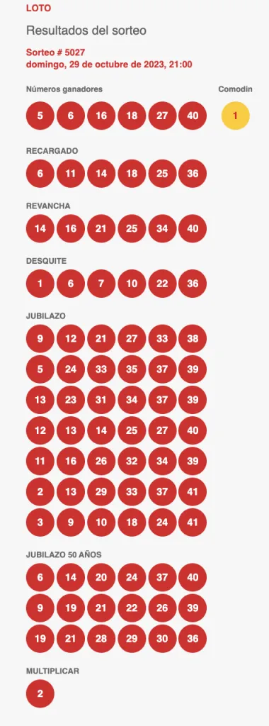 El sorteo del Loto N° 5027 se realizó este domingo 29 de octubre de 2023 desde las 21:00 horas. Se estimaba que una hora después estarían todos los resultados disponibles de manera online.