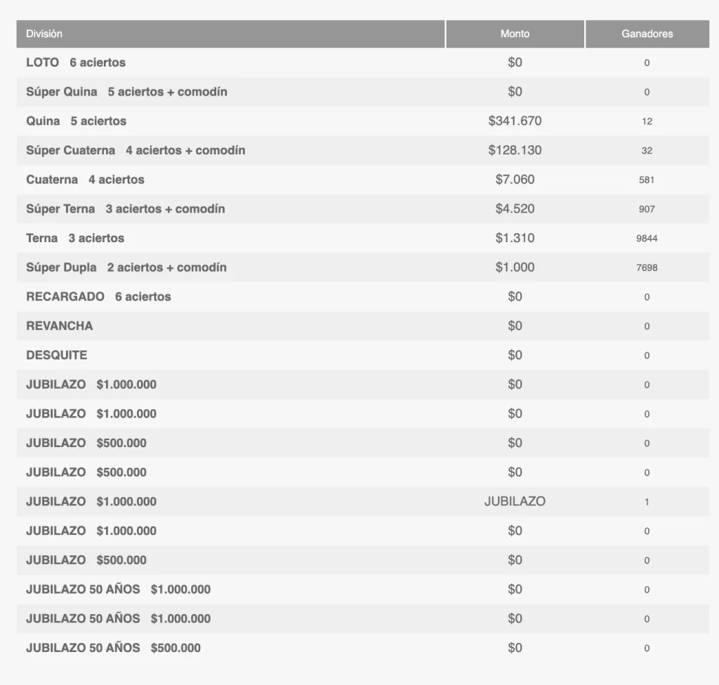 - Súper Quina 5 aciertos + comodín – $4.231.060 – 2 ganadores.