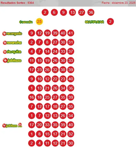 Números ganadores: 2, 6, 9, 13, 27, 36 y comodín 25.