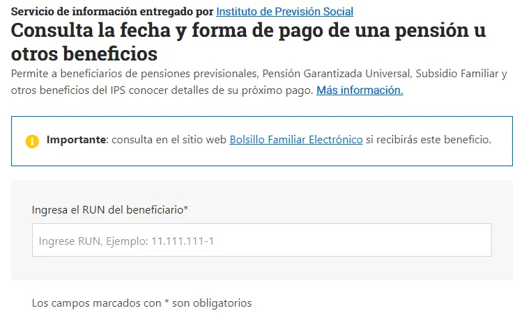 Esta consulta se debe hacer ingresando a www.mi.chileatiende.gob.cl/tramites/5212 con el RUT del beneficiario, de esta forma el sistema arrojará la fecha de pago correspondiente.