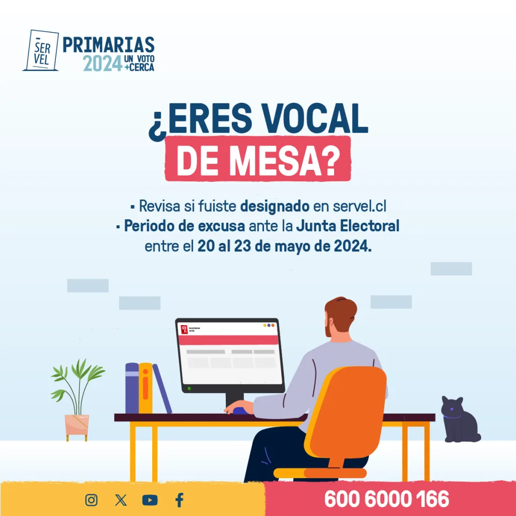 Para salir de la duda y consultar si fuiste designado como vocal de mesa, puedes llamar al 600 600 166 o ingresar a www.consulta.servel.cl y digita tu RUT en la casilla indicada (sin puntos y con guión).