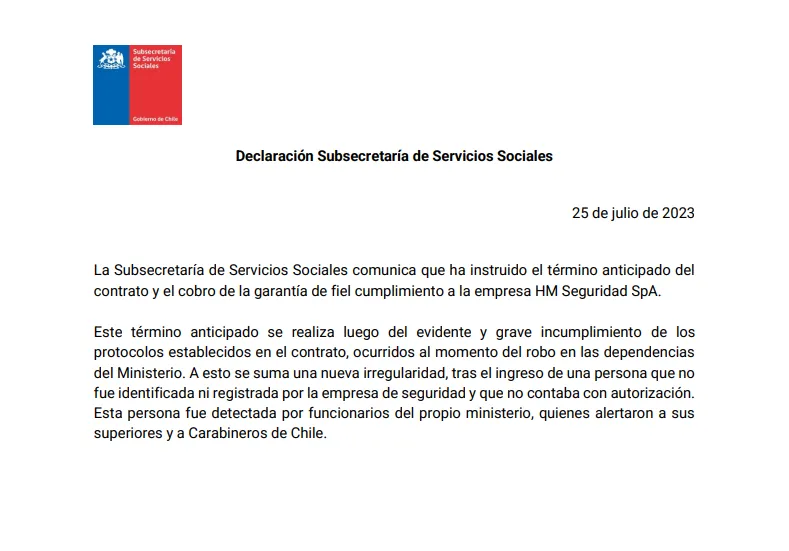 “Este término anticipado se realiza luego del evidente y grave incumplimiento de los protocolos establecidos en el contrato, ocurridos al momento del robo en las dependencias del Ministerio”, indica el comunicado de la Subsecretaría de Servicios Sociales