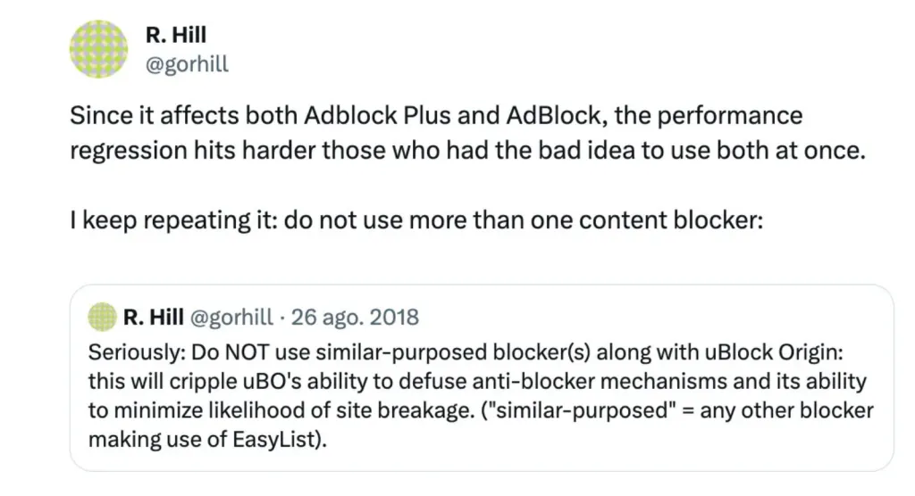 De hecho, el desarrollador de uBlock Origin (uno de los bloqueadores de anuncios con gran conocimiento), Raymond Hill, aseguró a través de sus redes sociales que “los usuarios que utilizan AdBlock y AdBlock Plus al mismo tiempo pueden enfrentar mayores dificultades”.