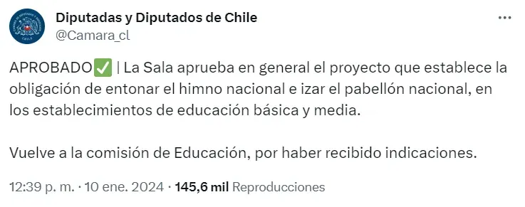 Esta semana la Cámara de Diputados aprobó la idea de legislar un proyecto de ley que busca decretar la obligatoriedad de cantar el himno en los colegios. La iniciativa fue aprobada por 126 votos a favor, 2 en contra y 3 abstenciones.