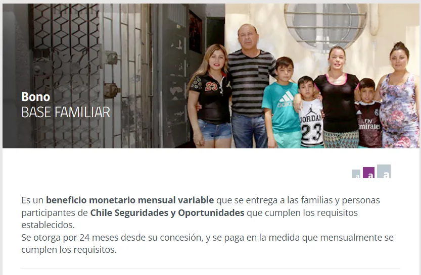 El Bono Base Familiar es un beneficio que se paga de forma mensual durante 24 meses a familias y personas participantes de Chile Seguridades y Oportunidades que cumplen los requisitos establecidos.