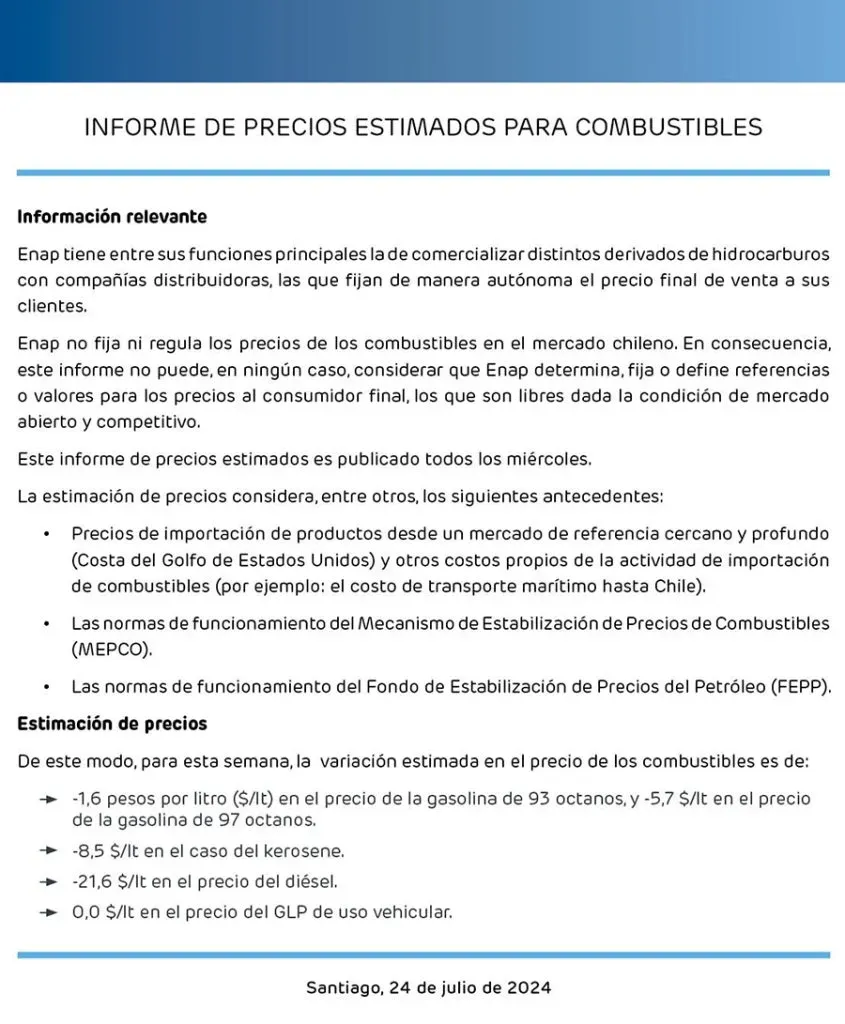 Los Informes de Precios de los Combustibles de ENAP con los respectivos cambios (alzas o bajas de precio) serán publicadas el día miércoles anterior a las fechas mencionadas.