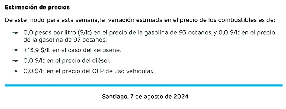 Se espera que un nuevo cambio se produzca el próximo jueves 15 de agosto y si suben o bajan los valores de estos combustibles se sabrá recién el día anterior, el miércoles 14, en un nuevo informe semanal de ENAP.