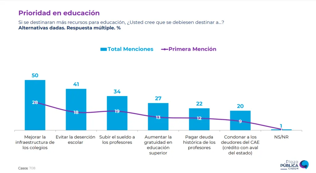 Vale señalar que el porcentaje en cuanto a menciones totales el CAE aumenta a un 20%, no obstante, las otras problemáticas también logran aumentos notorios, por ejemplo, mejorar la infraestructura en los colegios pasa de un 28% a 50% de las preferencias.