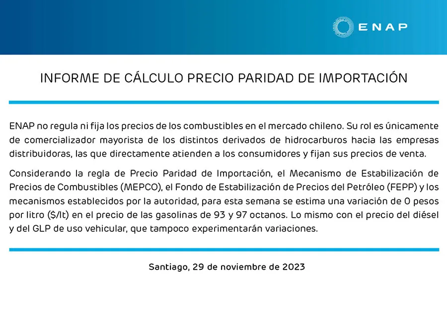 Según explica el Informe Cálculo Precio Paridad de, ENAP no es la institución encargada de definir los precios de la bencina en Chile, ya que la empresa estatal solo informa los valores cada semana.
